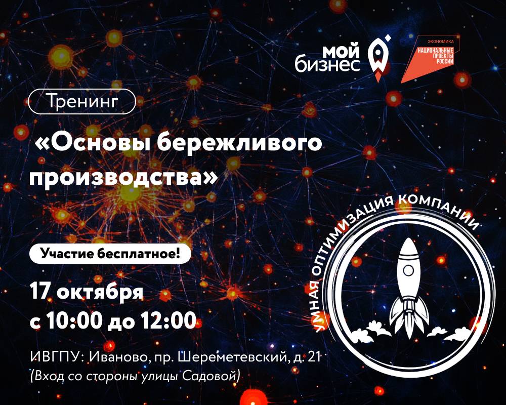 17.10.2025 10:00 Центр «Мой бизнес» приглашает на бизнес-тренинг: «Основы бережливого производства» Тренинг предназначен для руководителей предприятий (заместители генерального директора, руководители структурных подразделений, руководители по развитию).