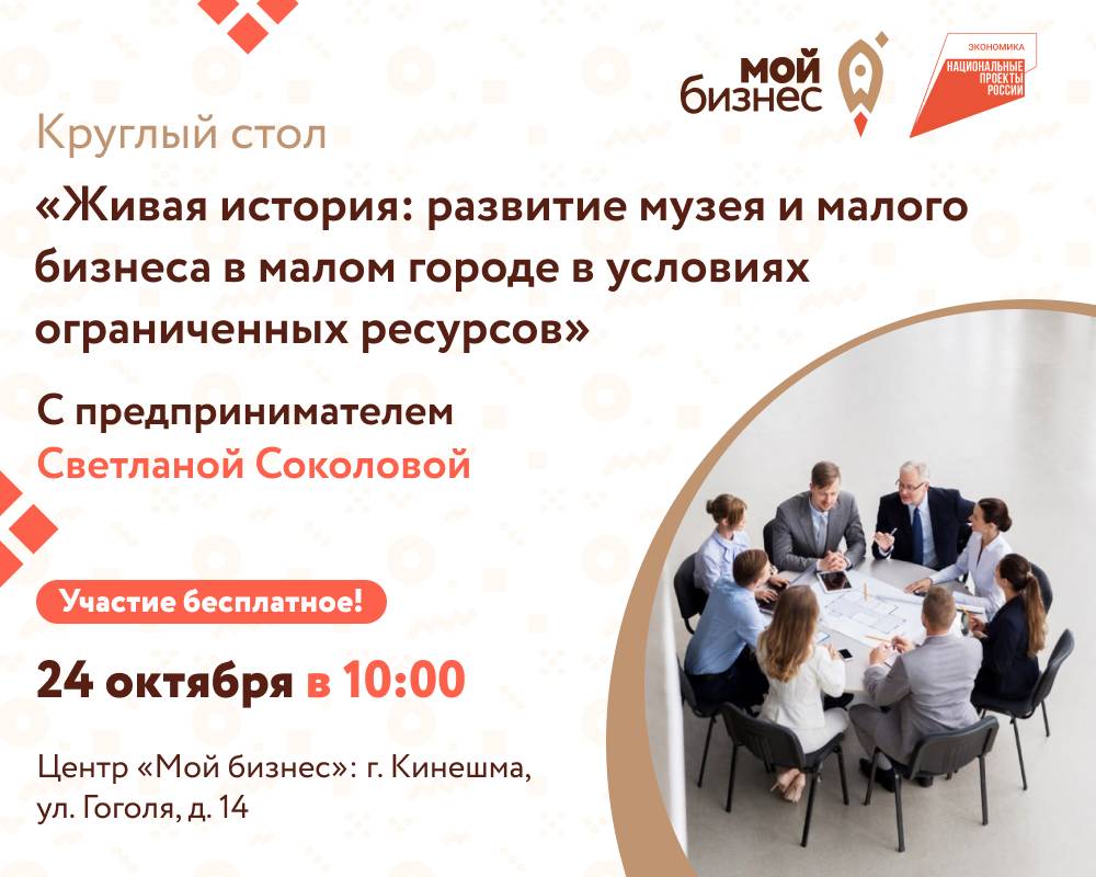 24.10.2025 22:00 Центр «Мой бизнес» приглашает на круглый стол с предпринимателем Светланой Соколовой Живая история: развитие музея и малого бизнеса в малом городе в условиях ограниченных ресурсов