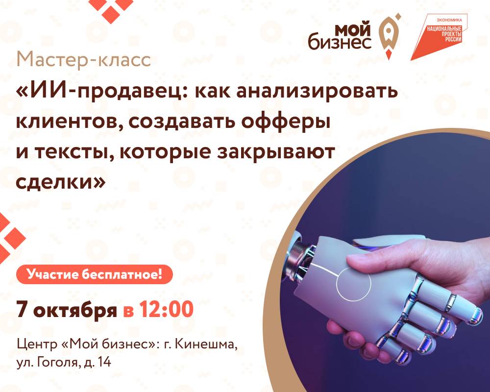 07.10.2025 12:00 Центр «Мой бизнес» приглашает предпринимателей на бесплатный практический мастер-класс: «ИИ-продавец: как анализировать клиентов, создавать офферы и тексты, которые закрывают сделки» Бесплатный мастер-класс для предпринимателей: как с помощью ИИ создавать офферы и тексты, которые реально продают, и повышать продажи без расширения команды. Требуется ноутбук.